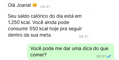 Personalize sua jornada, peça receitas, ajuste sua dieta e tenha controle total com ajuda da IA direto do seu WhatsApp.
